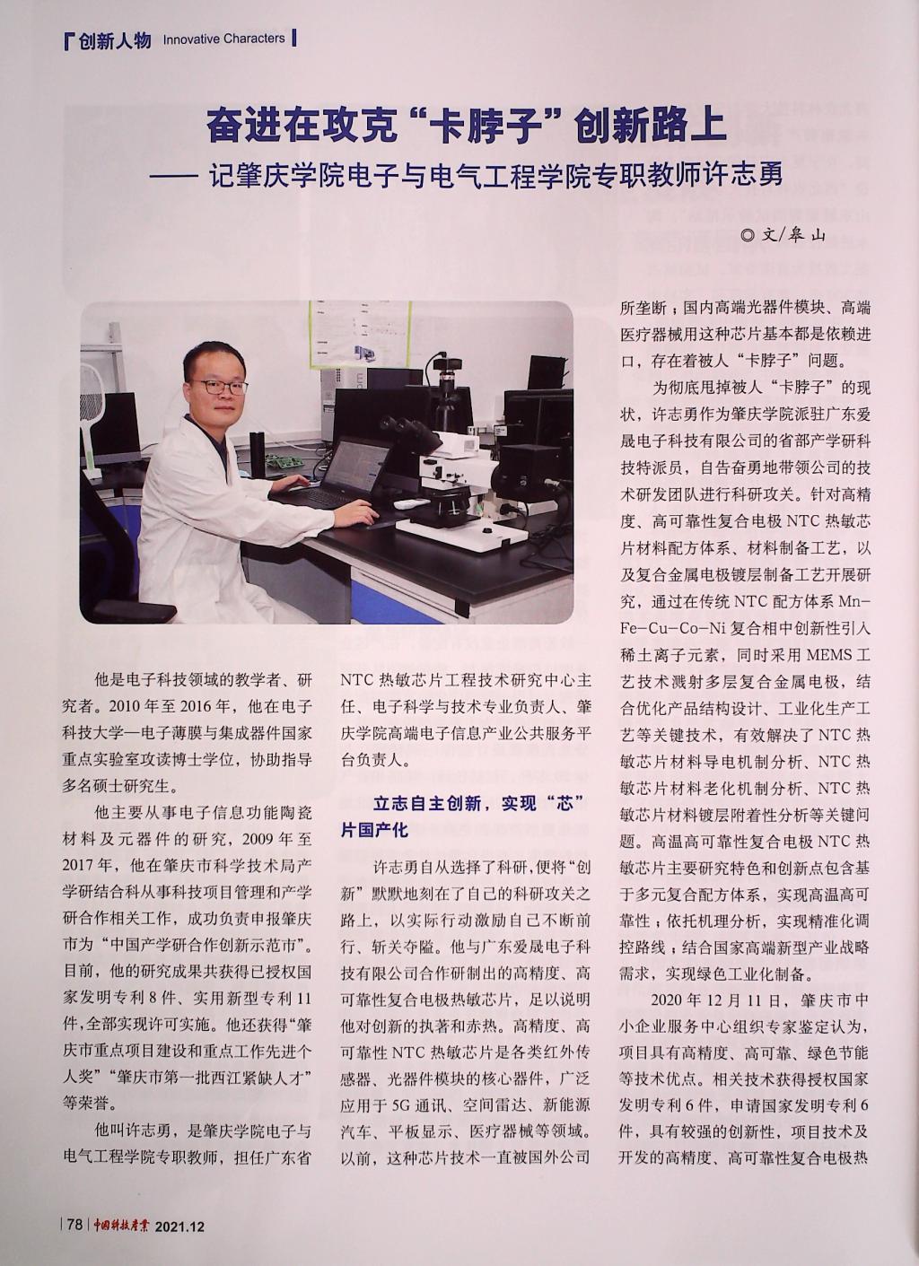 《中国科技产业》杂志2021年12期,刊登公司教师许志勇老师的先进事迹,题目是“《奋进在攻克“卡脖子”创新路上》—记bevictor伟德官网专职教师许志勇”。许志勇老师是电子科技大学博士学位毕业,是公司优秀教师代表,为人师表,教书育人,科研能力强,是公司电子与通信工程系年青的中坚力量。现转发相关内容以表扬宣传先进人物,期望继续发扬,争取更大成绩。
