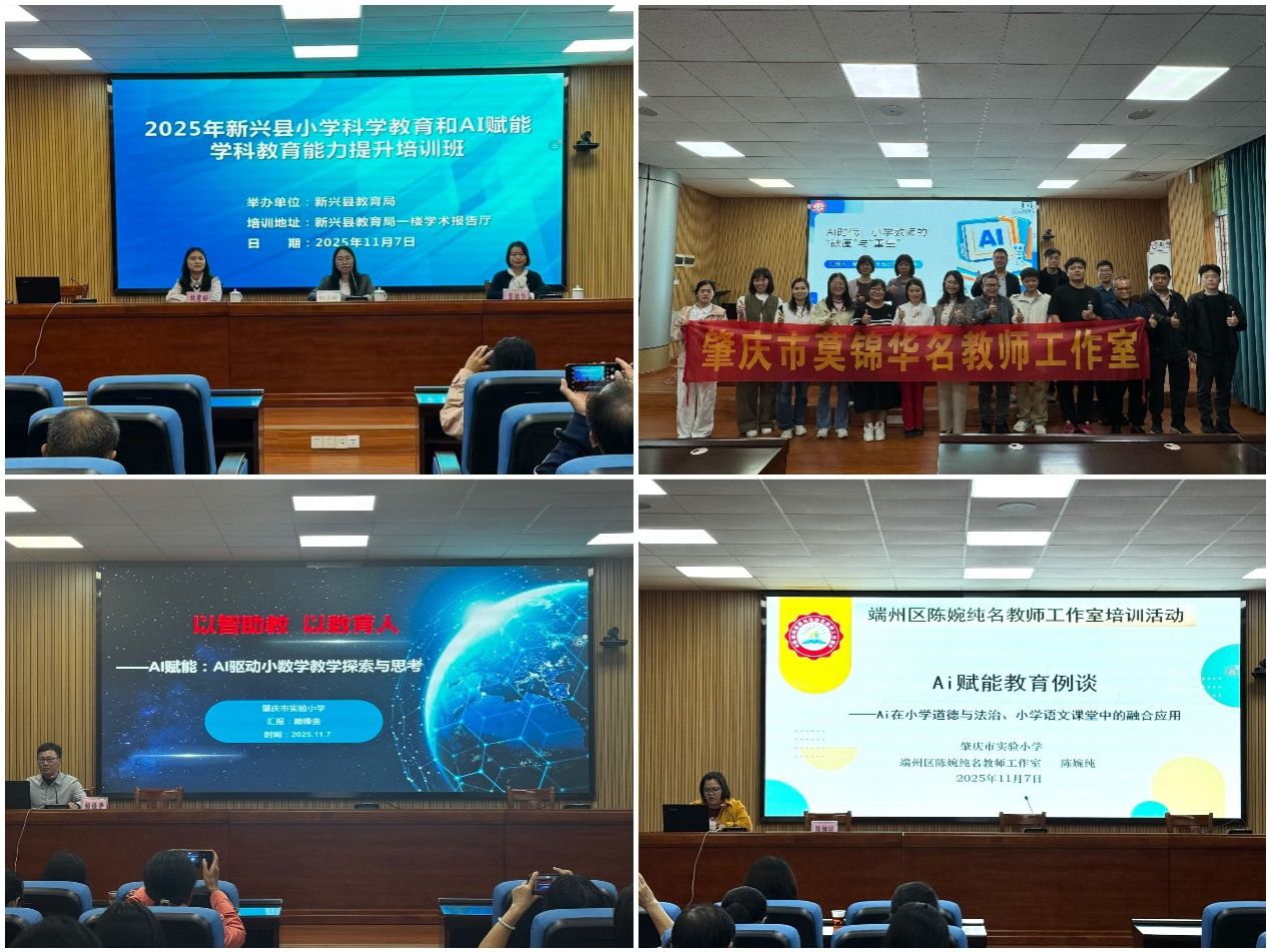 2025年11月7日,新兴县小学科学教育暨AI赋能学科教学能力提升培训班在新兴县教育局学术报告厅举行。培训分为“小学科学教育与信息科技能力提升”和“AI赋能学科教育能力提升”两大板块,特邀来自肇庆市实验小学的赖锋贵主任、肇庆市第十五小学的莫锦华主任等4位专家进行授课,内容涵盖科学教学策略、信息科技应用、AI与学科融合实践等,助力教师在“人工智能+教育”背景下实现教学转型与突破。