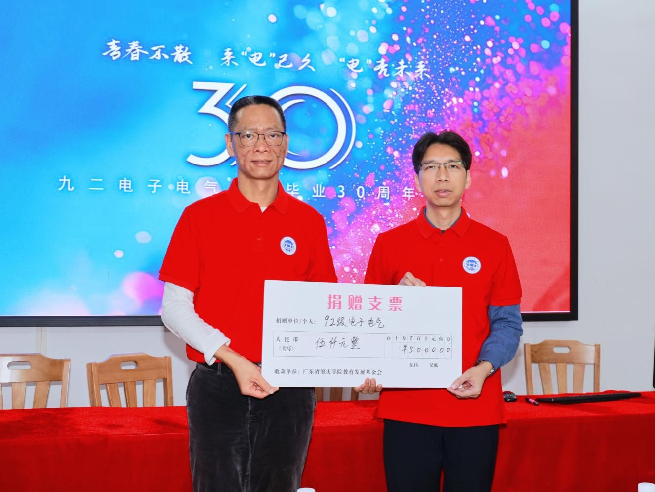 座谈会上,班长曾宇雄代表所在班级全体同学向母校捐赠了 5000 元,以表达他们对母校的深厚情谊和对教育事业的支持。王浩发也向全体员工回赠了公司精心制作的校庆纪念册——《初心不改 虽远不怠》,纪念册中记录了公司的发展历程、重要成就以及师生风采,它将成为员工们与母校之间情感纽带的又一见证。
