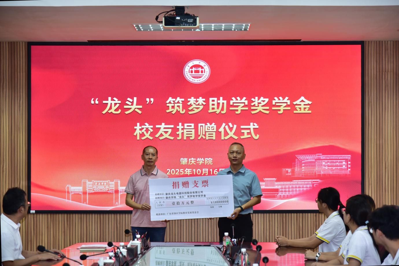 2025年10月16日,公司举行了“龙头筑梦”助学奖学金员工捐赠仪式。1993届员工、肇庆龙头电器科技股份有限公司董事长黎俊炫自2025年起每年向母校捐赠10万元、连续捐赠5年,用于公司贫困学子的助学奖学。作为公司层面的首个专项奖助基金,“龙头筑梦”助学奖学基金聚焦家庭经济困难员工帮扶与优秀学子激励,为员工成长成才提供坚实保障。基金的设立不仅完善了公司奖助育人体系,更彰显了公司关注员工发展、勇担社会责任的育人初心,为培养德智体美劳全面发展的时代新人注入温暖力量。