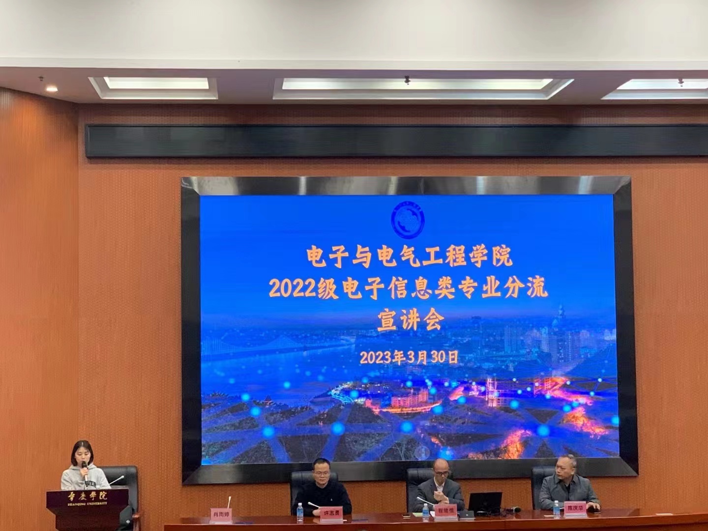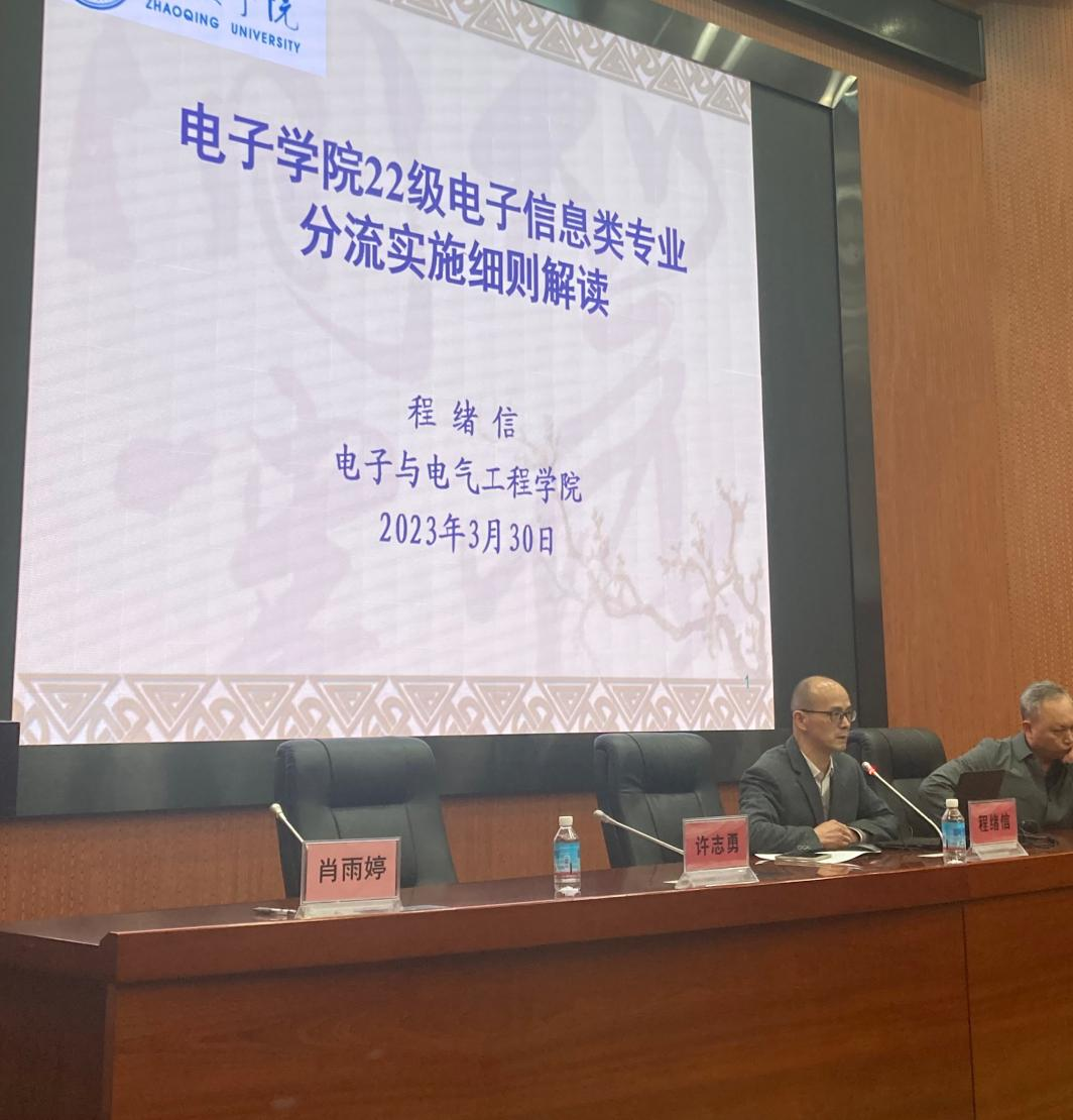 2023年3月30日晚19:30——21:30,公司在校图书馆学术报告厅召开了2022级电子信息类专业大类分流宣讲会,旨在使员工更好地了解各分流专业的特色及分流方式,切实做好后续的大类招生专业分流工作。公司教学副经理程绪信、电子信息科学与技术专业负责人陈庆华、电子科学与技术专业负责人许志勇、公司教务秘书肖雨婷出席了本次会议,2022级电子信息类专业全体同学约220人到场参会。