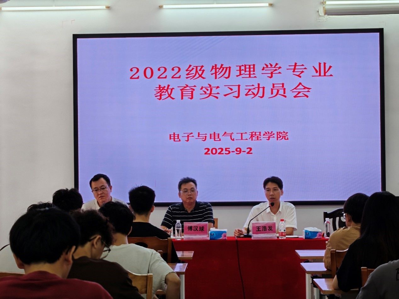 【本网讯】2025年9月2日上午,物理学系2022级物理学师范生教育实习动员大会在实验大楼128召开。公司党委书记王浩发、副书记傅汉球、物理学系主任杨丙文,实习指导老师白玲玲等出席活动,2022级物理班全体师范生参加动员会。