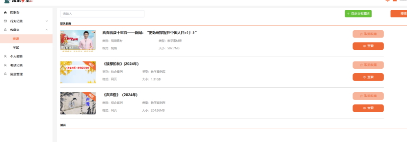 在资源列表界面中,每个资源的右侧,和资源详情界面的下部,均有“点击收藏”按钮。点击“收藏按钮”,选择”默认目录”,点击“添加”按钮,后可去个人中心查看