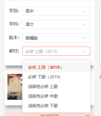 第三行为所选学段、学科对应的各类版本教材,点击箭头,显示教材版本列表,选择所需的教材版本。