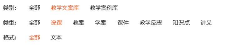 资源类别、类型和格式是相互关联的,例如,选择类别选择“教学文案库”,则类型中包括“说课”,“教案”,“学案”,“课件”,“教学反思”类型的资源如下图所示