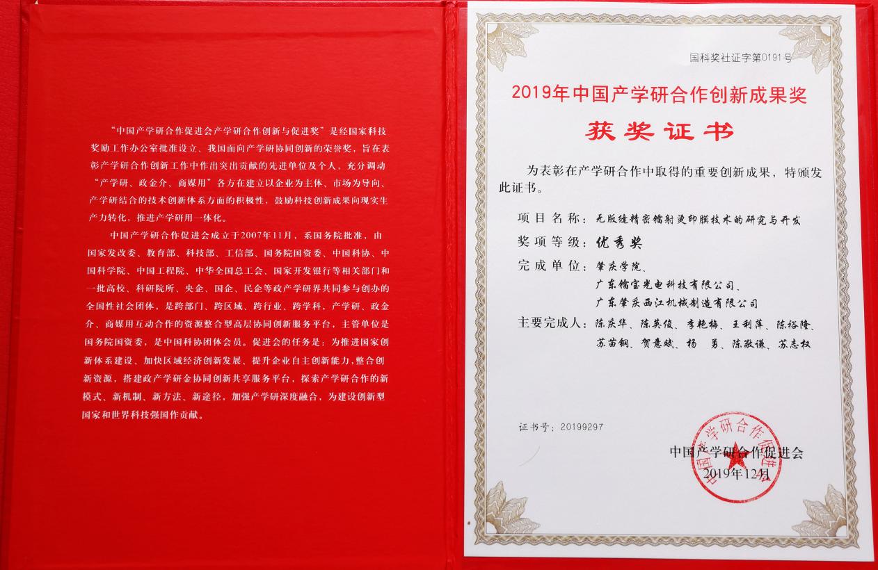 近日,中国产学研合作促进会公示了2019年中国产学研合作创新与促进奖获奖项目,公司陈庆华、陈英俊、李艳梅、王利萍、陈裕隆申报的项目“无版缝精密镭射烫印膜技术的研究与开发”获2019年中国产学研合作创新成果奖三等奖(伟德国际唯一官网入口为申报单位,广东镭宝光电科技有限公司、广东省肇庆西江机械制造有限公司为合作完成单位),实现了公司在国家级产学研合作创新与促进奖上的零的突破。