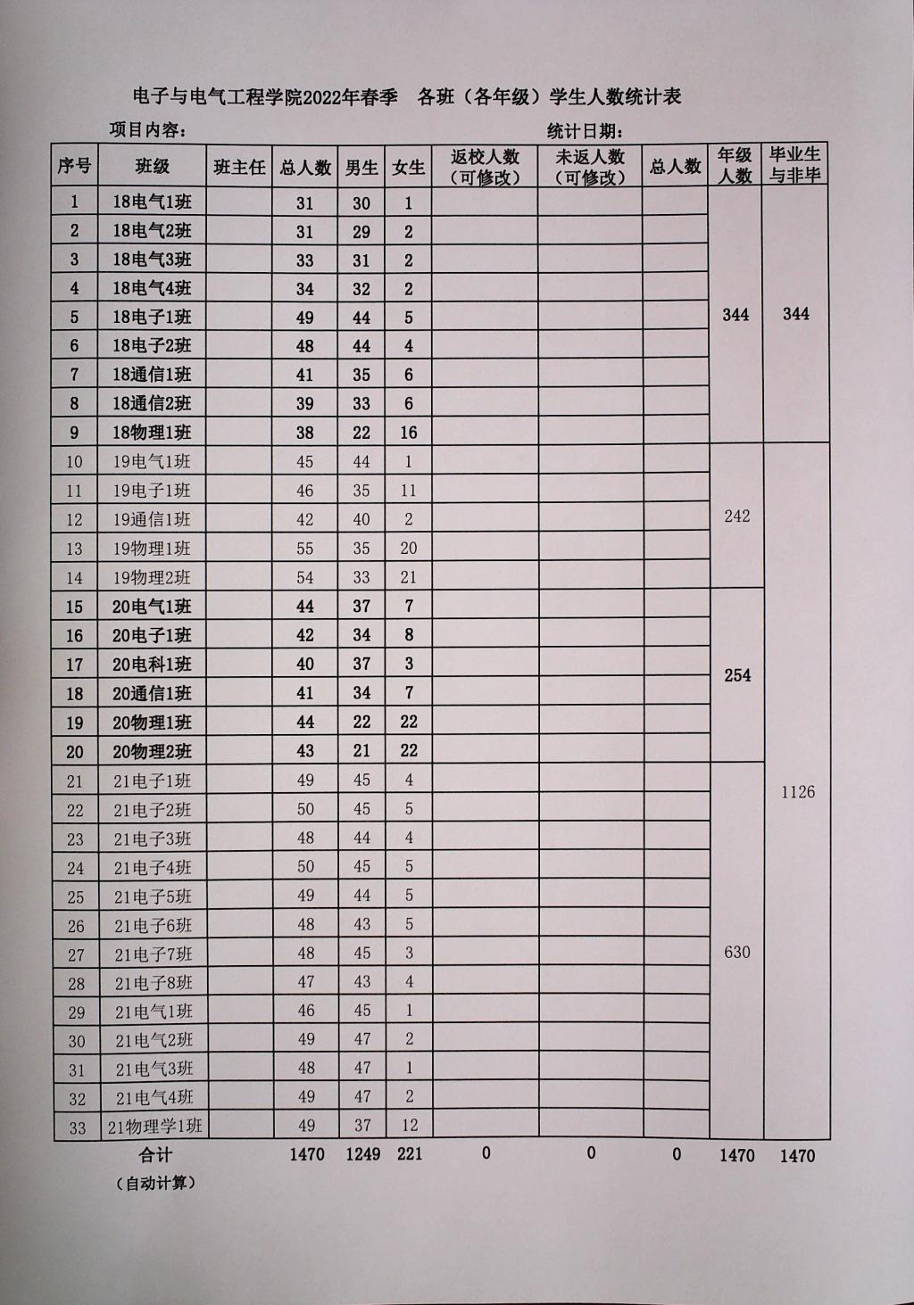 2022年春季各班(各年级)员工人数统计表(0301更新)
