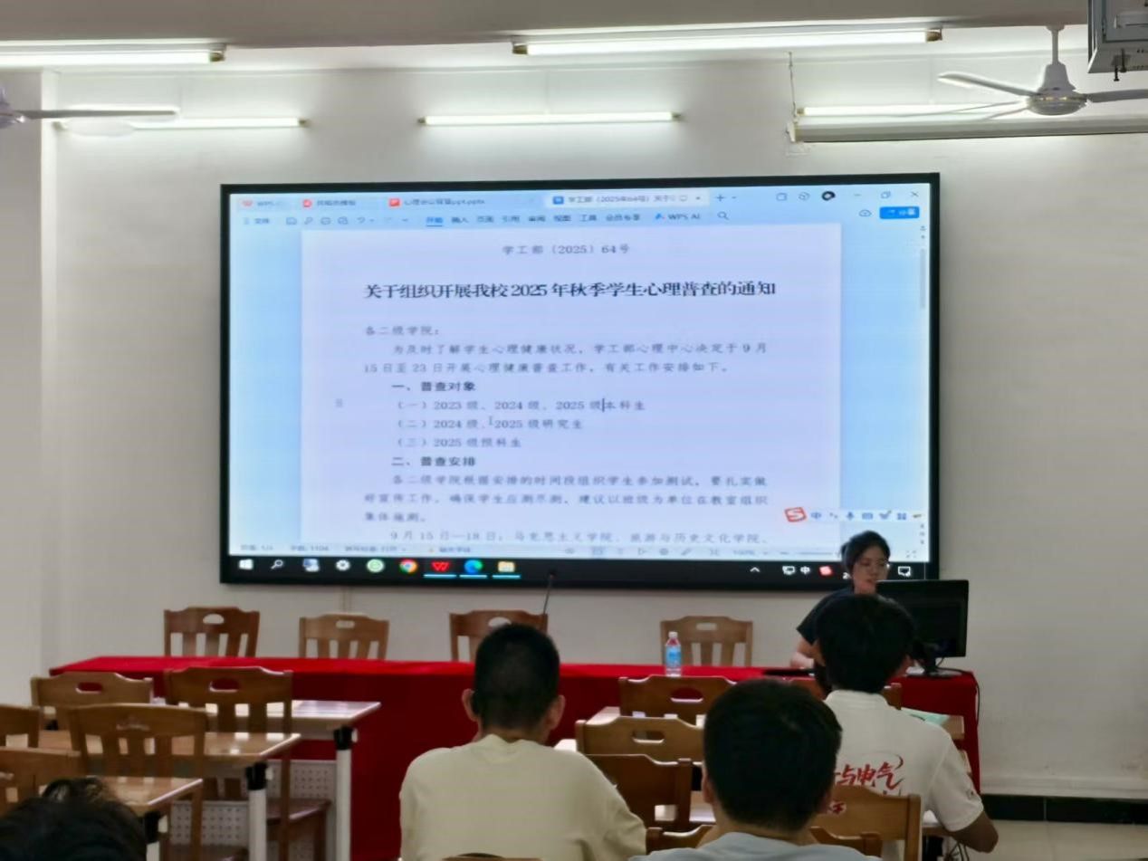 会议要求各班级要迅速行动,及时向同学传达心理普查要求与注意事项,全力保障心理普查工作如期完成,为后续心理健康教育工作打下坚实基础,持续为员工心理健康保驾护航。(通讯员 洪蕾)