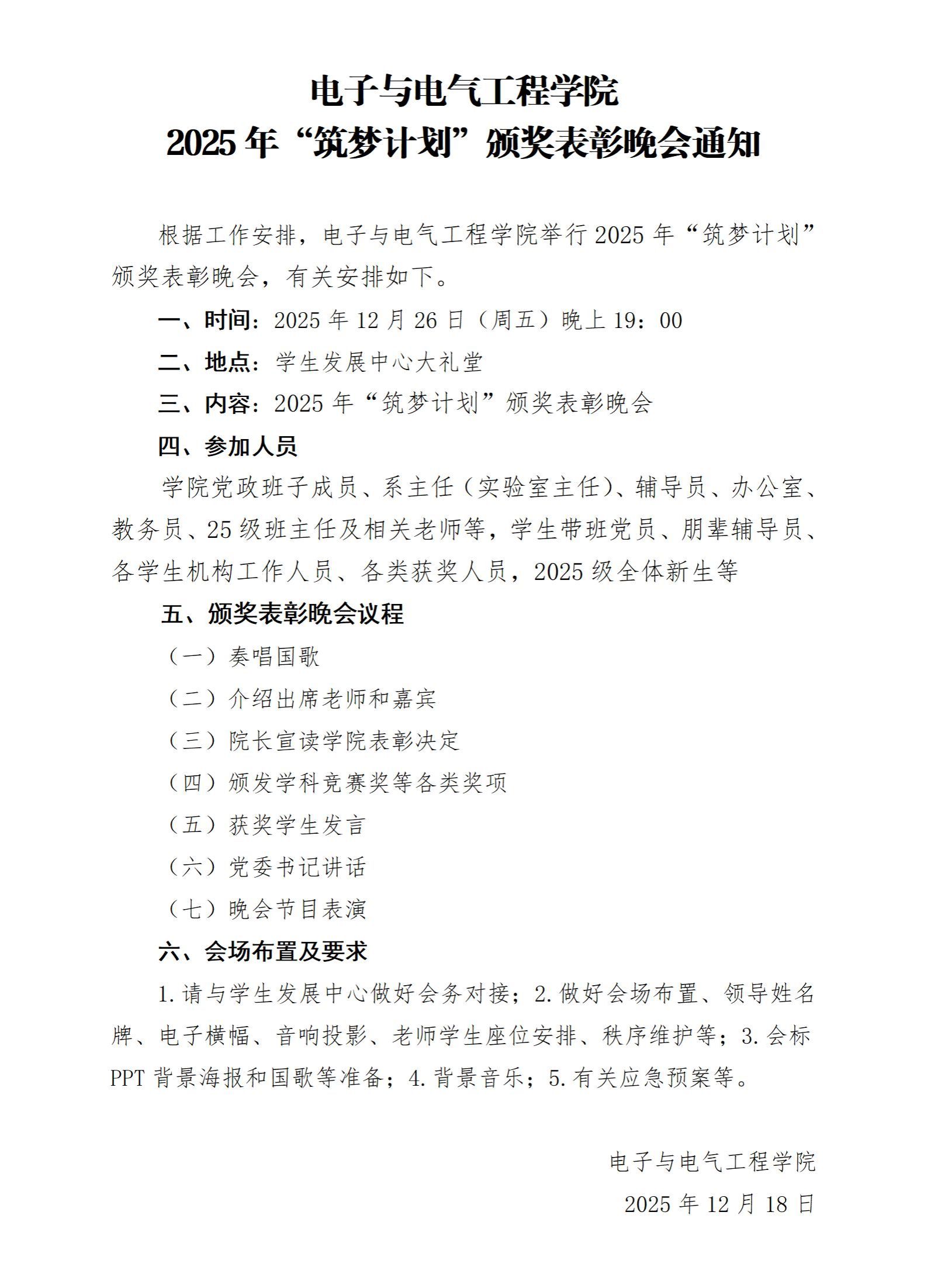 根据工作安排,电子与电气工程公司举行2025年“筑梦计划”颁奖表彰晚会,有关安排如下。