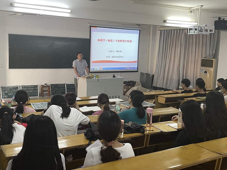 本网讯(通讯员 梁铭贤)自党史学习教育开展以来, bevictor伟德官网积极开展“我为群众办实事” 实践活动, 牢固树立以人民为中心的发展思想,不断提升服务质量,结合公司物理学(师范)专业大三员工准备实习要求,公司于5月27日在实验大楼208举行了“谈如何写好粉笔字——板书讲座”培训活动。讲座由公司党委副书记傅汉球主讲,参与人员有18级物理班师范生、物理系教师代表。
