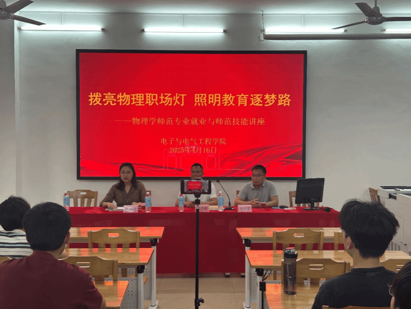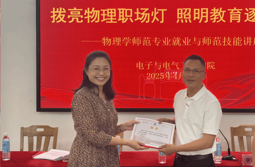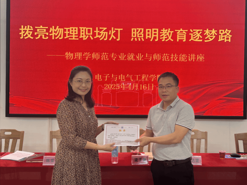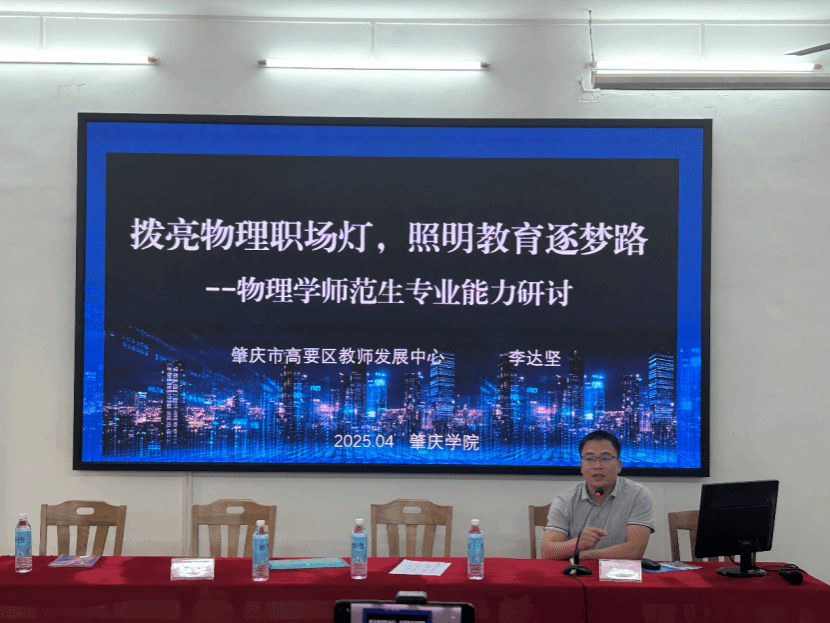 4月16日下午,公司在实验大楼128举办“拨亮物理职场灯,照明教育逐梦路”主题讲座,特邀高要区教师发展中心副主任梁子豪、高中物理教研员李达坚(物理员工)担任主讲嘉宾。副经理陈荣荣,物理系教师杨丙文、刘愉快、白玲玲,以及物理系30多位同学聆听了此次讲座。