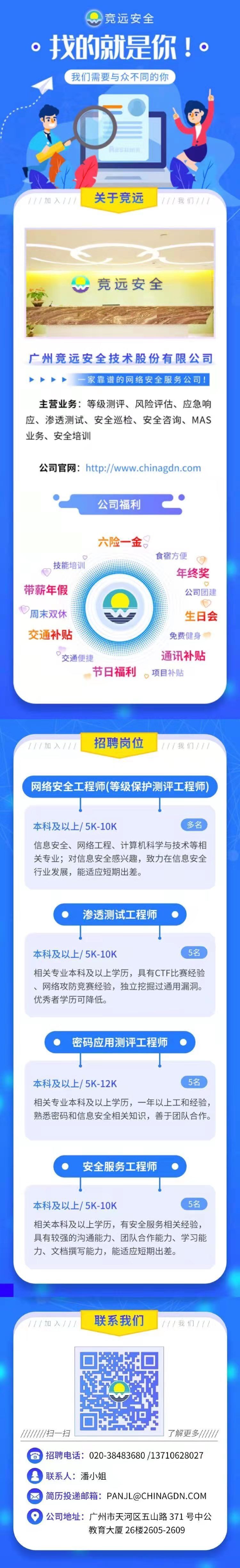 广州竞远安全技术股份有限公司诚招信息安全工程师、网络工程师、等保测评工程师 需求 15人(年薪8W-15w)