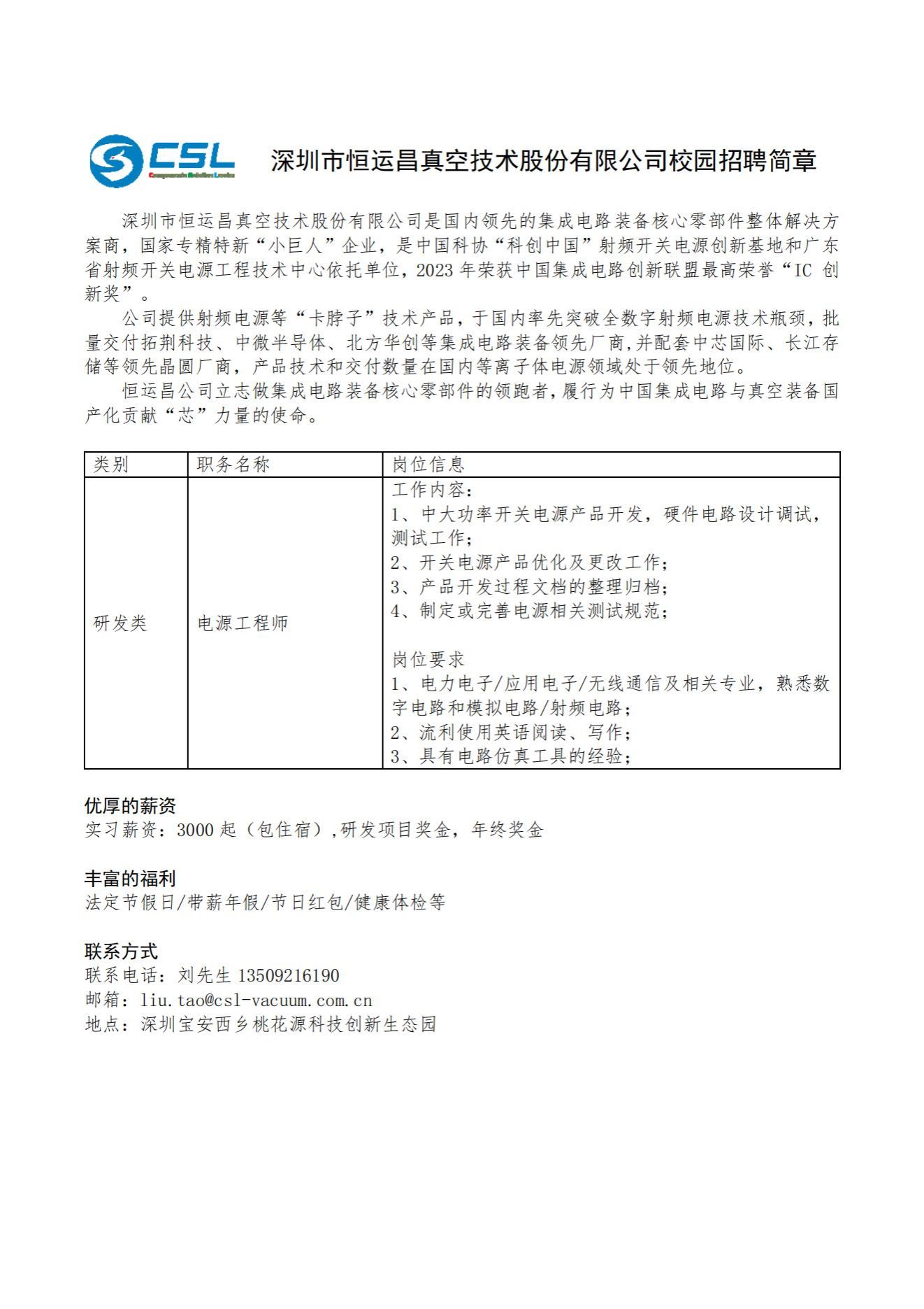 深圳市恒运昌真空技术股份有限公司2025届校园招聘简章