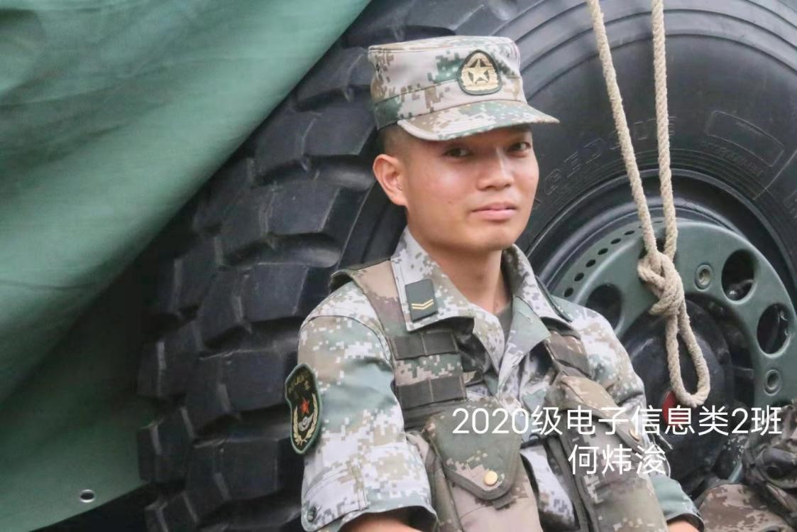 我是19电气一班的黄灶明,于2020年退出现役。国徽戴在头顶,血液流淌忠诚。军人所走的路和太阳一样,每天伴着晨曦余晖周而复始。光荣在于平淡,每天早晨的起床号声早已融进了我的血液里。在日常无数次的挑战自己极限中磨练自己,在班长无数次的训诫中磨平自己,在战友无数次鼓励中成就自己。穿上了军装,就是选择了坚强。生命中最不后悔的就是参军,国家兴亡,匹夫有责,保卫祖国,若有战,招必回。