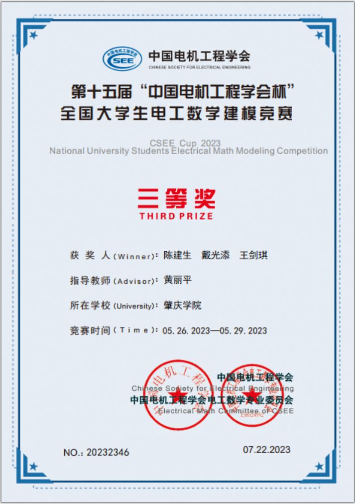 【本网讯】近日获悉,2023年第十五届“中国电机工程学会杯”全国老员工电工数学建模竞赛获奖名单公布,公司2021级电气专业员工陈建生、戴光添、王剑琪三位同学荣获三等奖,指导老师是电气工程系黄丽平博士老师。这是公司员工首次参加该项竞赛并获奖。