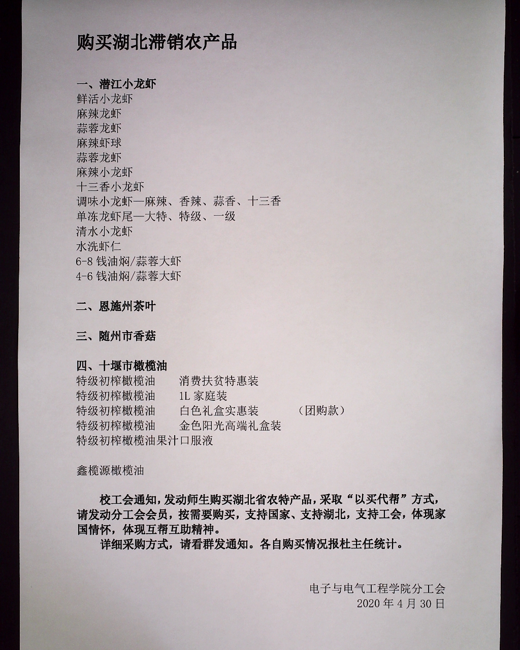 校工会通知,发动师生购买湖北省农特产品,采取“以买代帮”方式,请发动分工会会员和员工,按需要购买,支持国家、支持湖北,支持工会,体现家国情怀,体现互帮互助精神。