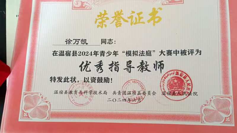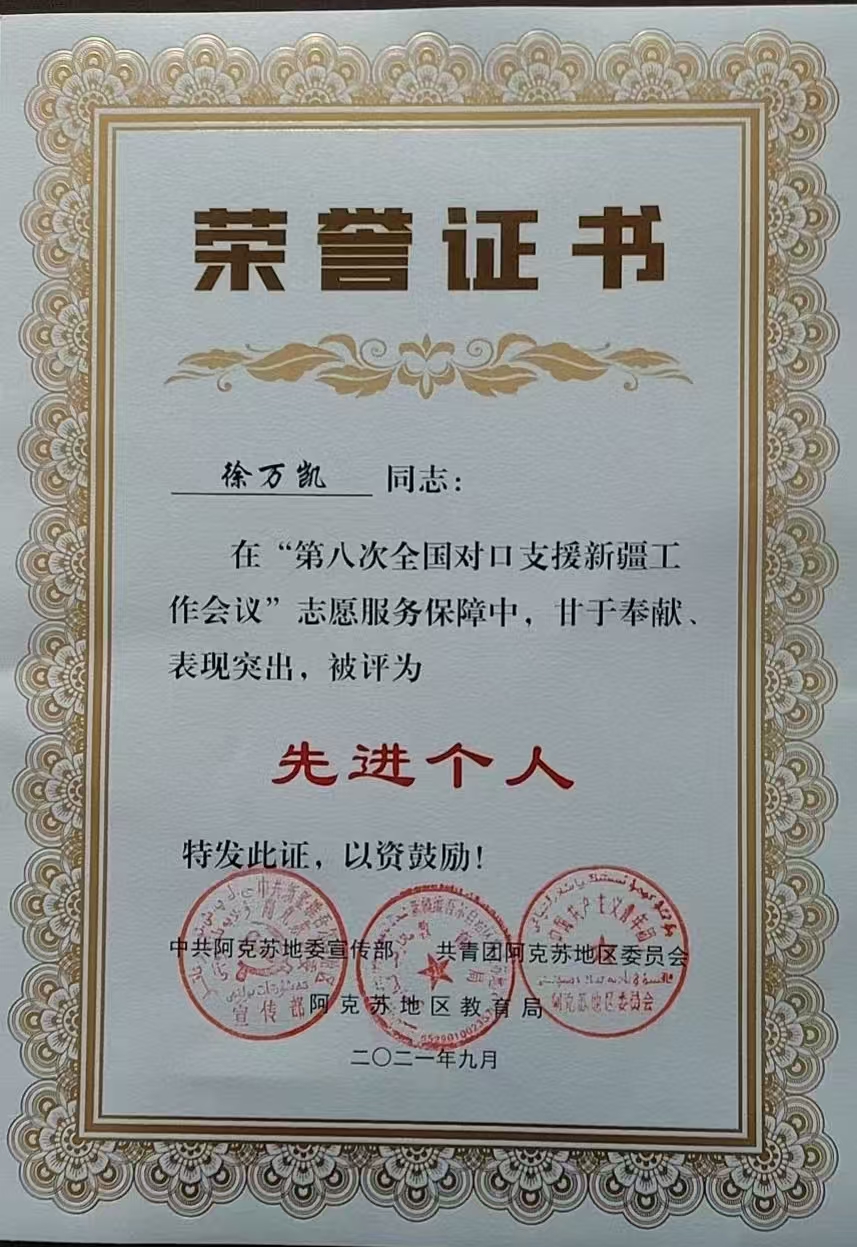 徐万凯始终坚持“立德树人”的根本任务,将德育工作融入公司产品全过程。他关心爱护每一位员工,特别是对学习困难员工给予更多关注和帮助。他经常利用课余时间与员工谈心,了解他们的学习和生活情况,帮助员工解决实际困难。在他的关怀下,许多员工走出了心理困境,重新找回了自信和快乐。五年来累计资助贫困员工10名,无偿给员工提供4000余元的学习用品,家访行程累计2000余公里,帮助50余名员工解决学习困难。在2024年温宿县青少年模拟法庭大赛中,他指导员工深入研究案例,理解法律精神,将物理学科培养的逻辑思维与法庭辩论所需的严谨论证相结合。他指导的团队最终获得优异成绩,他本人也被评为优秀指导教师。